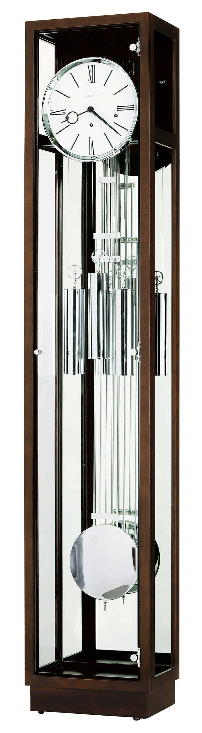 - Hinged, front door with polished chrome knob features a glass window which offers a view of the polished chrome finished grid pendulum and weight shells.