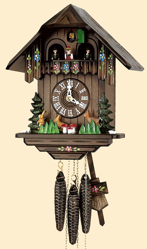 Coucou chalet avec décorations peinte à la main. Les animaux bougent et les danseurs tournent lorsque la musique joue.