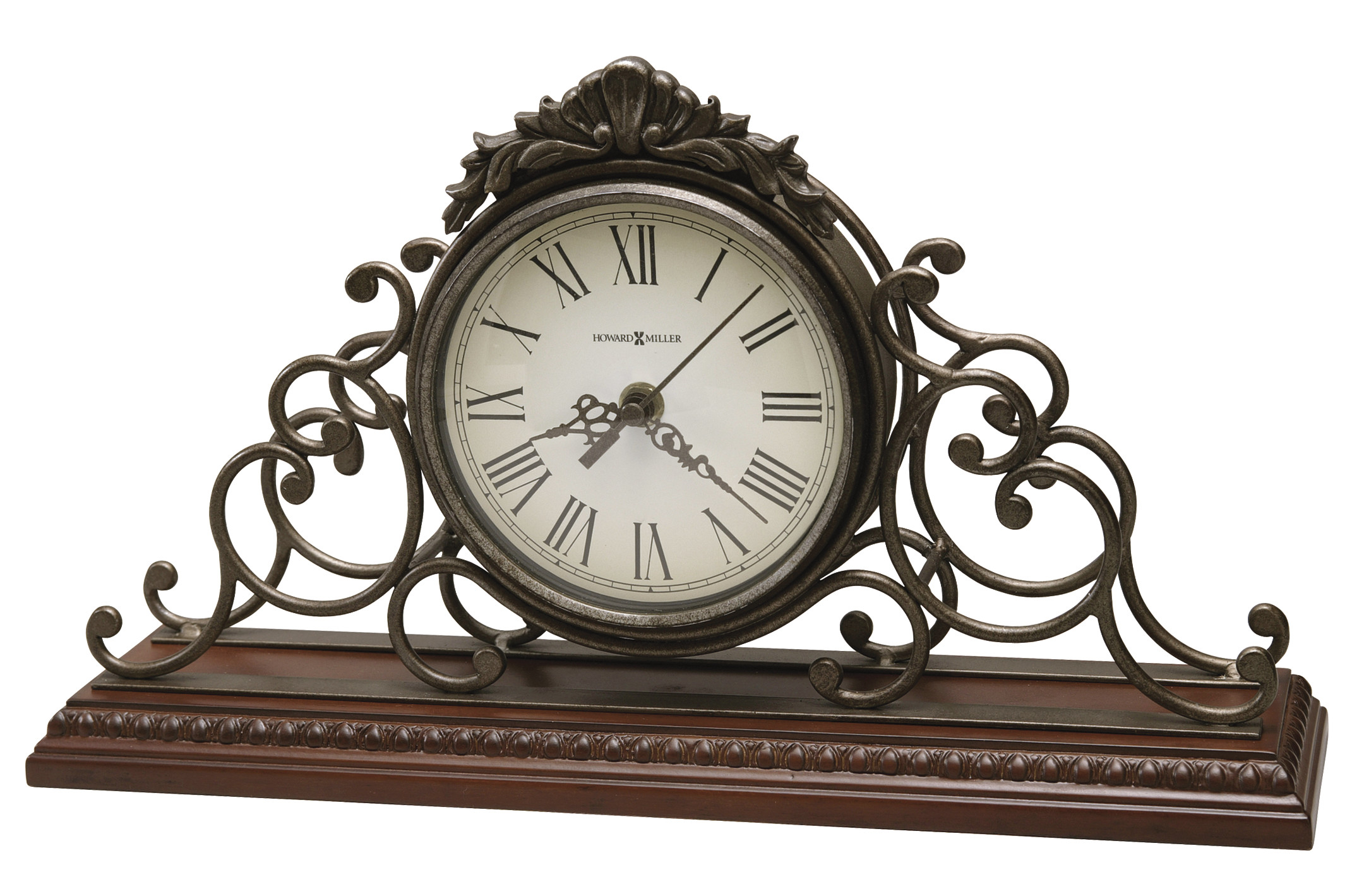 - This ornate chiming mantel clock features a sculpted wrought iron frame with decorative cast crown, antique warm grey finish, and sits on a Windsor Cherry finished base. Decorative molding runs completely around the base.